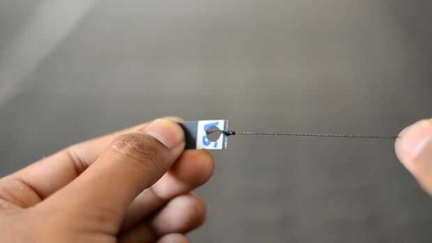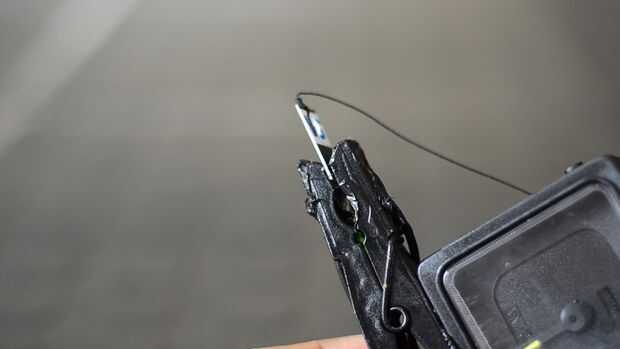 Enhebrar el sedal por el agujero y átelo firmemente y luego deslice pedazo de tarjeta de crédito entre las mordazas de la clavija.