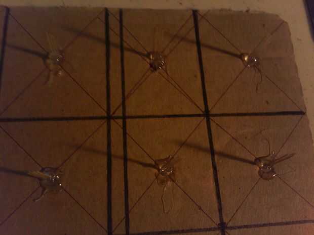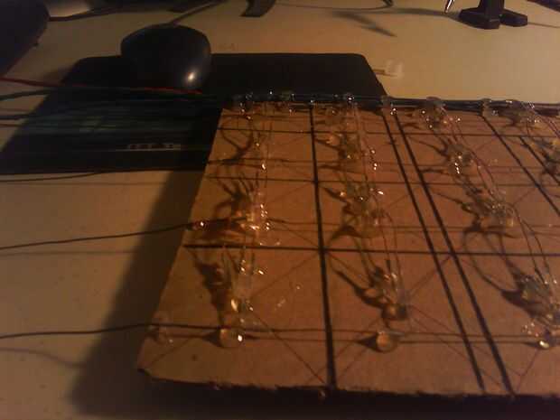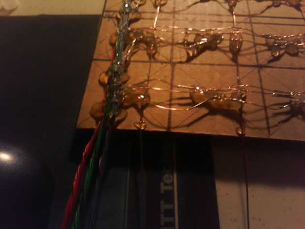 Para tener la matriz afecta ser posible que necesita alambre los LED RGB de una determinada manera. Va de arriba a abajo en la parte trasera parte superior izquierda esquina la Plaza, comienza fila 4 columna 1, en esta fila que será el mismo para todas las filas que se necesita que toda la tierra lleva desde el RGB soldadas juntas en una línea o fila. Entonces en esta columna se trata de la misma para todas las columnas que necesita para conectar todo el Color conduce en una línea o columna. Los conductores rojos todos conseguir soldados en una columna independiente Haz soldados todos los cables azules en una columna independiente y todos los cables verdes Haz soldados en una columna independiente.
