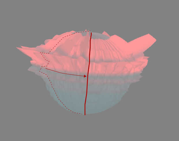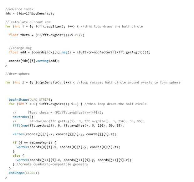 la fila actual traduce a sonido el espectro sonoro y estirar para que quepa en un semicírculo. el valor en el intervalo de //each del espectro se traduce entonces en un cambio de magnitud, irradiando desde el centro de la esfera.