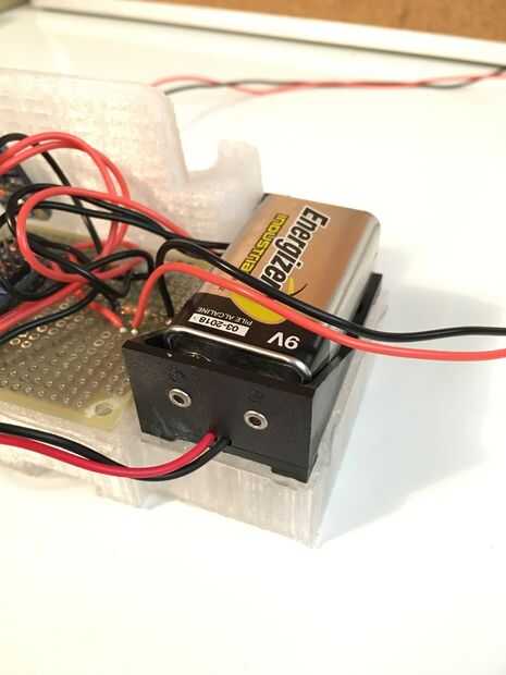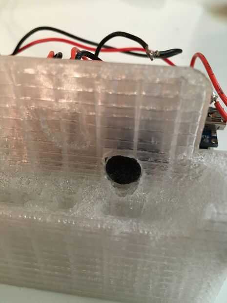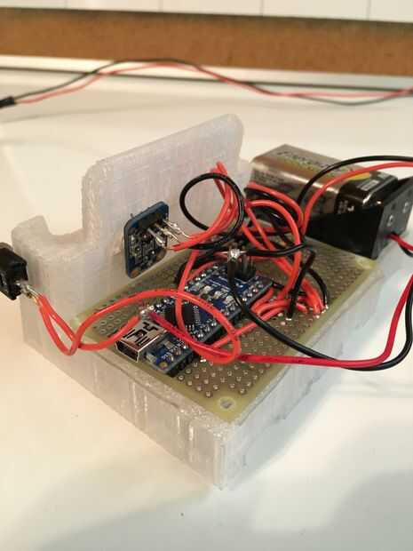 Perforó un agujero en mi estructura para colocar mi sensor de los sonidos cerca de los altavoces del teléfono y luego había pegado mi sensor en su lugar. Usted puede considerar su soporte de impresión con este agujero añadido. Luego pegados a mi Junta soldadura en el compartimiento trasero de mi titular y colocó mi batería en el compartimento que está en el lado del titular del teléfono.