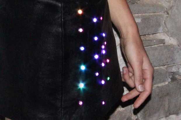 Por un tiempo, he querido añadir un micrófono a uno de mis proyectos usables. Recientemente, tuve la idea de hacer una falda reactiva sonida y arreglo de los LEDs como barras de ecualizador. Integrando la electrónica correcta sin hacerlas visible no era demasiado fácil ya que la falda tiene un ajuste ajustado. También quería que la falda de ecualizador para parecerse a una falda normal sin los agujeros en él cuando las luces están apagadas. Me tomó un tiempo encontrar el LED derecho y el método, puesto que previamente hechas tiras de LED o LED-hebras eran demasiado voluminosa y no lo suficientemente flexible como para la falda.