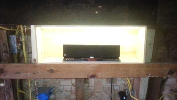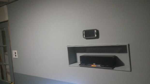pongo el altavoz en la pared con salidas con cable detrás de la pared (no es necesario para el proyecto, pero tenía la pared abajo de todos modos) cables de esa manera allí no sería ninguna muestra. Hay muchas maneras de hacerlo, he utilizado paneles muy finos e hizo una caja montar el altavoz con habitaciones a cada lado para cosas diferentes entonces funcionó los cables a través de un agujero en la espalda cual fue alineado con el conector de alimentación.