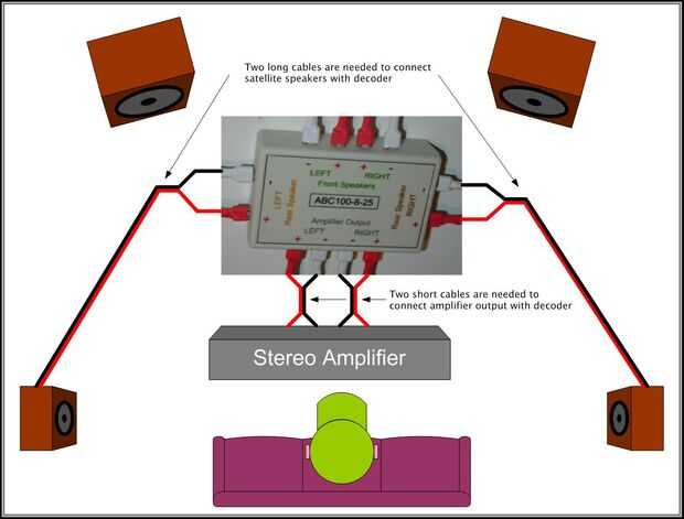Los parlantes satélite deben crear un trapecio, rectángulo o cuadrado con los altavoces delanteros. Se necesitan dos cables cortos para conectar la salida del amplificador con el decodificador y se necesitan dos cables largos para conectar altavoces satélite con decodificador.