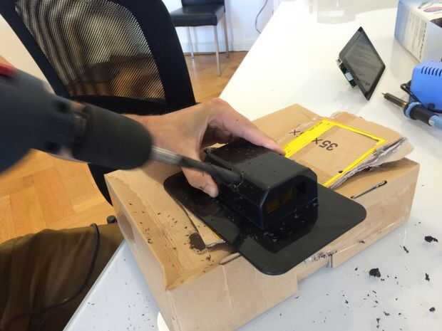 Compruebe las dimensiones de salida de la tarjeta de sonido y su distancia desde la parte inferior de la pantalla táctil. Con estas especificaciones puede marcar el área en el caso que tiene que ser eliminado para poder conectar la tarjeta de sonido