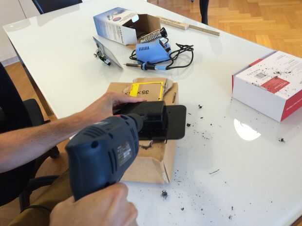 Utilice un taladro hacer un agujero donde han marcado las salidas de la tarjeta de sonido. Compruebe si el caso se ajusta cómodamente en el sistema. Si no, simplemente ampliar los agujeros hasta que no haya presión en el caso ya.