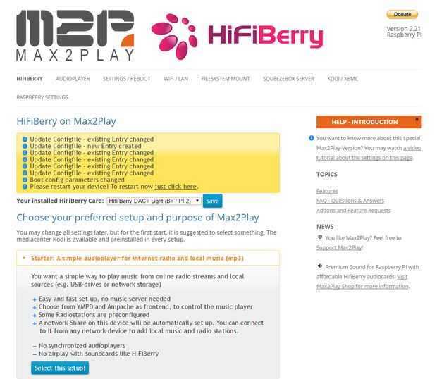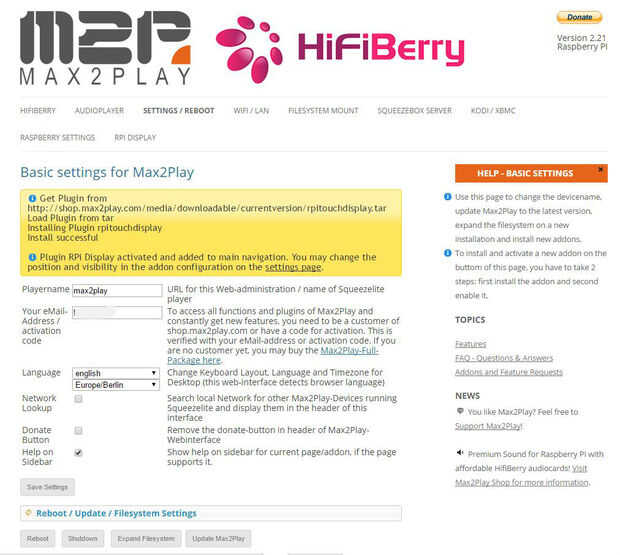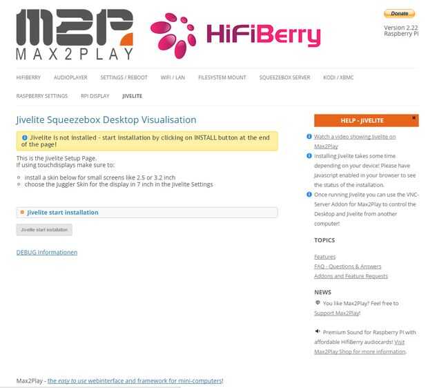 Ahora es el momento de la instalación del software. Max2Play ya ha hecho todo el trabajo pesado con su imagen de plug-and-play. Sólo necesitamos hacer unos ajustes en la interfaz web, que podemos alcanzar en cualquier dispositivo conectado a la red local, así como con el navegador. Simplemente teclee http://max2play/ en la barra de URL.