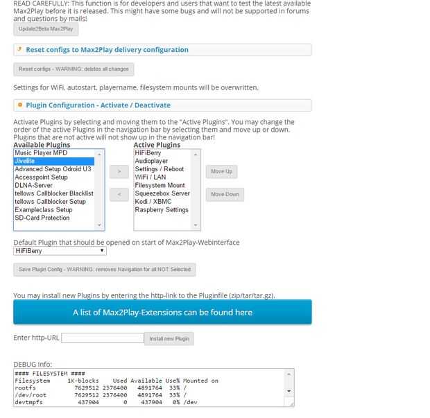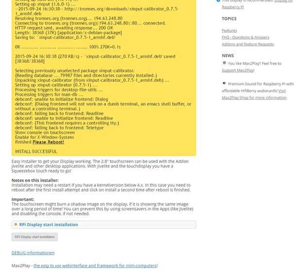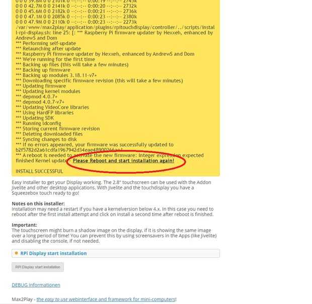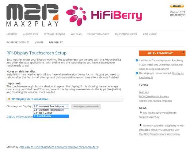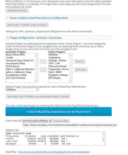 Ahora solo necesitamos un plugin más para activar la pantalla táctil; nuestro addon pantalla de RPi. Tenemos que añadir a la sección de plugins copiando la URL de la fuente de la lista de plugins en Max2Play.com. Una vez hemos hecho esto, sólo tenemos que seleccionar nuestra pantalla de 7 pulgadas y haga clic en instalar. Luego tenemos que reiniciar y haga clic en instalar otra vez para adaptarse a la actualización del kernel. Este es el último paso y si tenemos Jivelite de autostart, ya podemos empezar a reproducir música cuando nuestro sistema está arrancado.