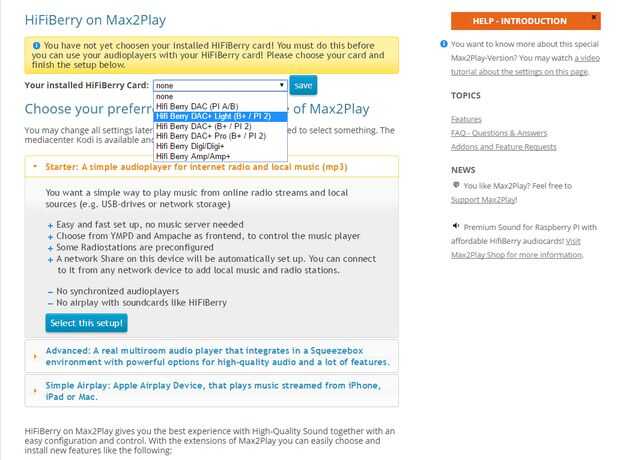 Con la imagen de HiFiBerry, primero podemos configurar nuestra tarjeta de sonido. Simplemente seleccione desde el menú desplegable haga clic en guardar, reiniciar el sistema y la tarjeta de sonido está activado. Los plugins dos premium que necesitamos para esta configuración son el instalador de Jivelite y la pantalla de RPi. Por favor asegúrese de que tener el sistema de archivos ampliado, activado la licencia premium y el sistema actualizado antes de instalarlos.