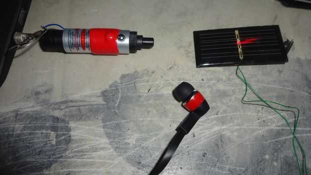 Cómo funciona, el laser es hackeado con el gato audio y conecta con cualquier dispositivo personal, aquí estoy usando Laptop funcionar el láser, una vez que el archivo de sonido se reproduce la luz comienza a transferir el sonido mediante luz, por otra parte el panel solar se utiliza (con ninguna fuente de energía adicional) del láser recibir el sonido y el panel solar está directamente relacionada con el auricular que recibe el poder así como el sonido desde el panel solar. voalla su láser de sonido inalámbrico distancia amplia está listo. El mismo método puede utilizarse con el micrófono láser.