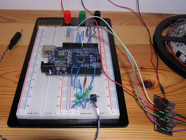 Como una fuente de 12V se puede utilizar alguna fuente de alimentación 12V DC o batería de plomo, pero ten en cuenta 1 metro de tira del RGB LED puede consumir hasta 15 vatios.
