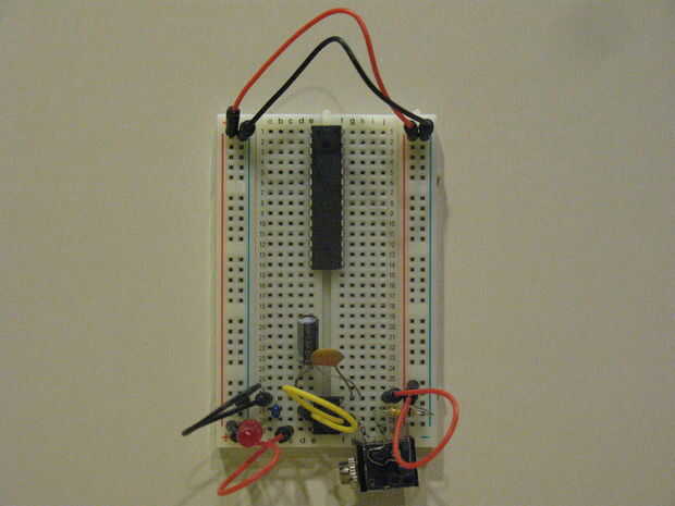 ** Para reprogramar y experimentar fácilmente, es posible agregar un oscilador de 16Mhz en las patillas 9 y 10 de la protoboard y programa con un arduino Uno tablero de modificaciones del código MIDIsprout. El ATMEGA328 puede también ser reprogramado a través de ICSP con un programador externo (otra arduino) y un laberinto de cables puente ;)