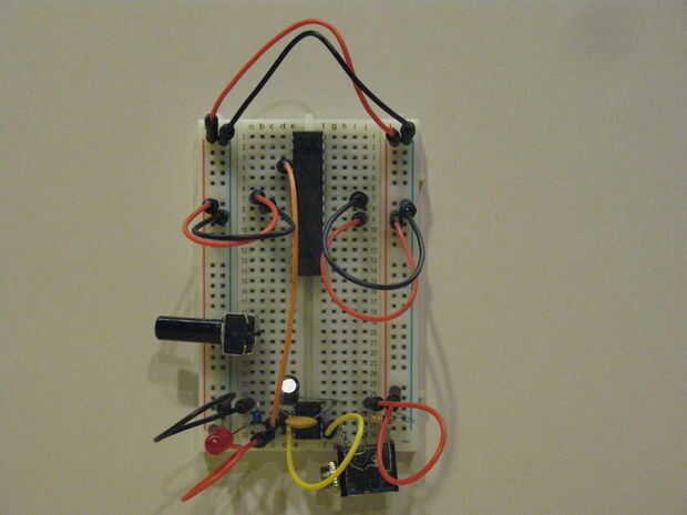 Se preparara la perilla incluida doblando suavemente sus tres patas (doblar los tres al mismo tiempo) por lo que la perilla puede colocarse verticalmente. Inserte la perilla en el lado izquierdo de la protoboard en filas de la columna A 19, 20 y 21.'