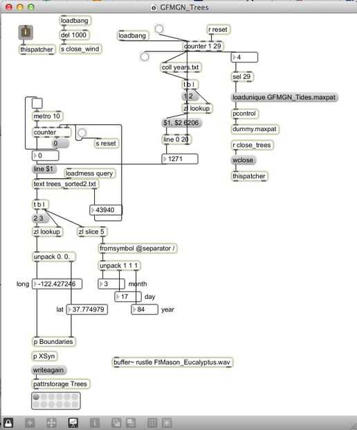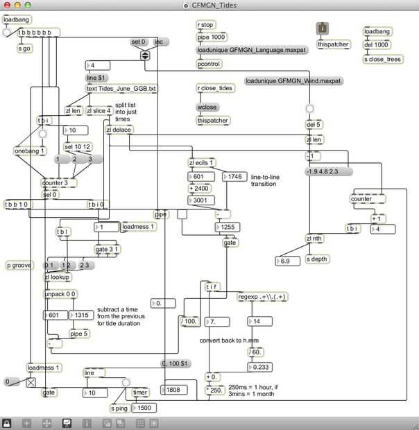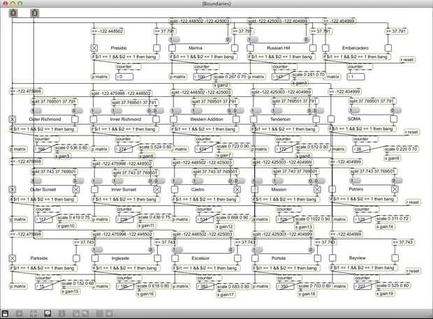 Es difícil explicar este paso con mayor detalle. Me encontré con retos y escollos que fueron en gran parte única en el conjunto de datos específico que escogí y los sonidos que estaba tratando de hacer con ellos. Porque estos elementos variará grandemente dependiendo de lo que usted podría optar por sonify, la instrucción específica se convierten en difícil. Dicho esto, he añadido algunas imágenes de mi código (usando Max/MSP) a continuación para dar una idea.