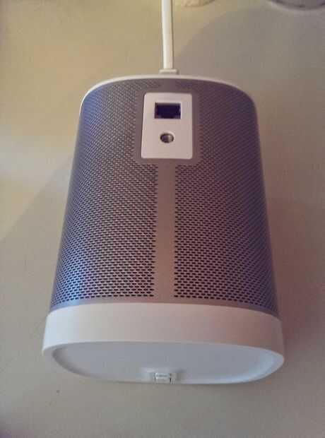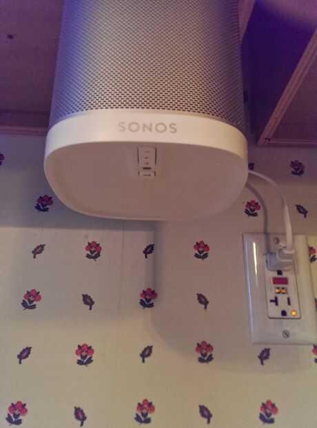 El jugador como un puerto Ethernet, un cable y un punto de montaje de 1/4-20 en la parte inferior de la unidad. Hay botones encima de la unidad para el control de volumen y play/pausa. Instalando el jugador boca abajo, cabe hasta debajo del armario y permite el acceso a los controles. En esta instalación no estoy usando el puerto Ethernet, por lo que está cubierto por el soporte de la posición. Si ese puerto es necesario, haga un orificio en el soporte a aceptar el cable Ethernet.