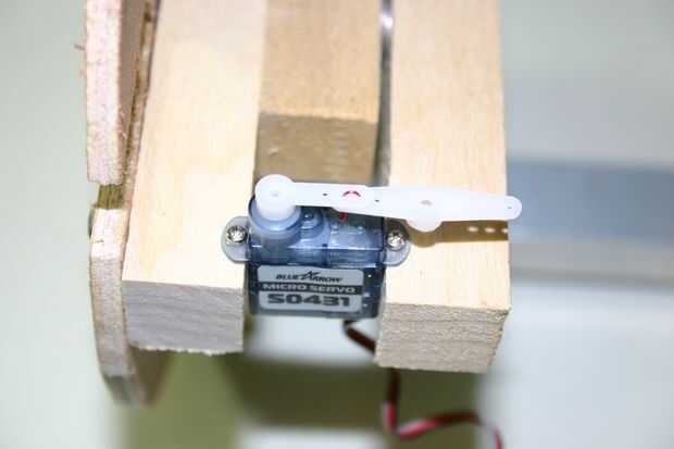 Con los tornillos pequeños con el servomotor, instale el motor en el ensamblaje de bloque de madera.
