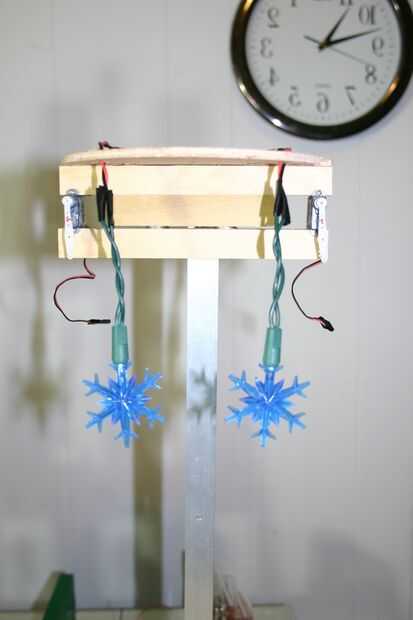 De una cadena de luces de Navidad LED, quite dos luces como ojos.  Elegí azul estrellas, pero globos ar que funciona cualquier color de su elección.  Soldar cerca de 3 pies de cable #22 a los cables de luz y este hilo por el disco.