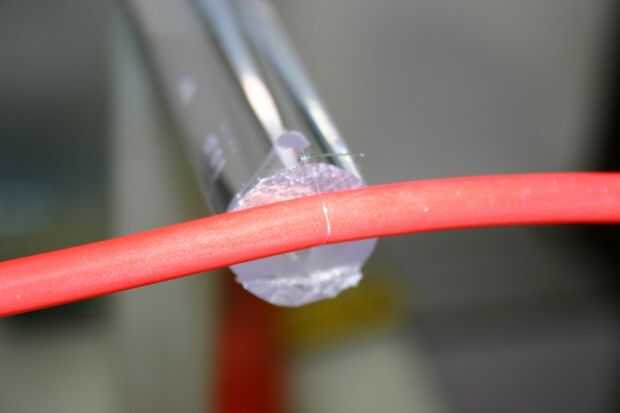 Corte un 6 1/2 pulgada de largo pedazo de "lente correa titular" (o cualquier tubería flexible) y coloque el centro en la barra de acrílico con lineas de pesca.