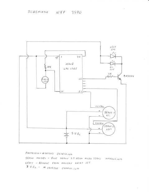 Voltaje a través de un par de resistencia/fotocélula cambia cuando cambia la cantidad de luz que llama la atención la fotocélula. Este voltaje se suministra a los 1768 LPC (microcontrolador, podría utilizar un Arduino, sólo significaría usando pernos diferentes y diferente software código) como una entrada analógica. Salidas de la LPC 1768 encienda los ojos LED y activan dos servomotores.  Los servomotores son conectados por la línea de pesca a los extremos de la boca de goma flexible.