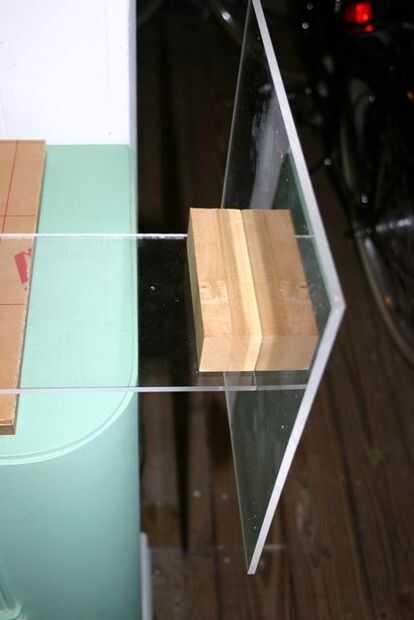 Usando un 2 pulgadas por 2 pulgadas bloque de madera, colocar el acrílico vertical para un base cuadrada de acrílico de 12 pulgadas.