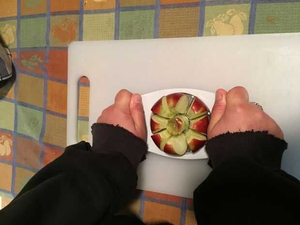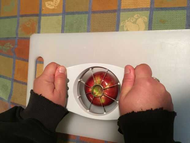 Colocar la manzana en la tabla de cortar y con el descorazonador, corte la manzana en 8 pedazos