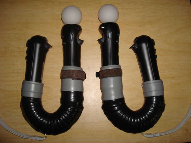 Bueno VR necesita controladores que pueden ser rastreados e integrados y utilizados. El Move de SONY controladores pueden ser obtenidos fácilmente y barato como la cámara involucrados (conseguir un acuerdo y podría ser tan bajo como $3 por controlador). Un problema ha sido cómo conectar el controlador de navegación (un gran controlador poco por cierto) y el regulador del movimiento (la bola Glowy uno) para que pueda tener seguimiento en cada mano pero todavía uso los palillos en los controladores de navegación. Pues ahora lo tienes!