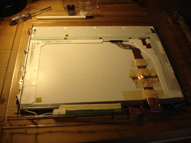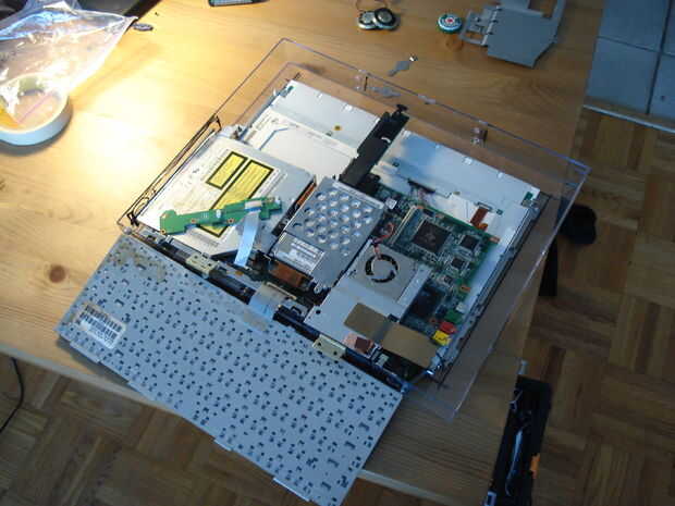 Vuelva a montar y todo vuelva a conectar a la placa base antes de colocar encima de la pantalla LCD. Fije la placa base a la parte inferior de la estructura con agujeros de tornillo en la parte posterior de la Junta. Pegue el tablero con el botón de encendido al frente de la caja usando cinta adhesiva o pegamento caliente (necesita enchufarlo y envuelva los cables en la parte inferior del marco de la primera).