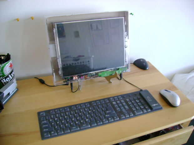 Más tarde compré un teclado flexible y estructura soporte de cuadro (también en Michael). Después de agregar un ratón inalámbrico que colgaba alrededor, el producto final es realmente bastante cerca de un iMac (?) como se puede ver en la imagen.