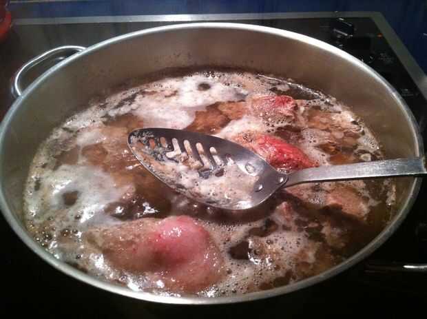 La espuma va a recoger en la superficie desde el principio. Desnatar con una espumadera. Usted puede hacer esto dos veces.