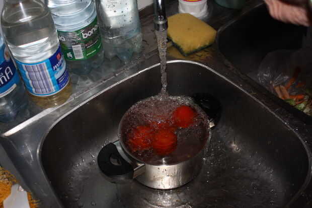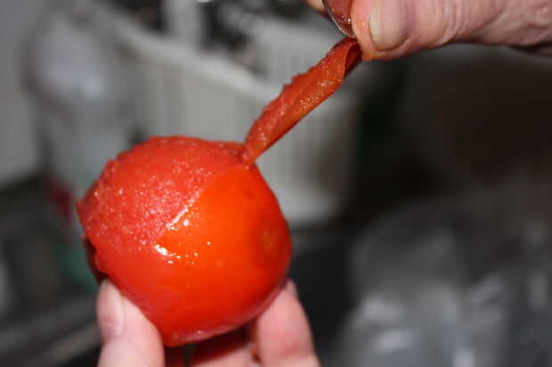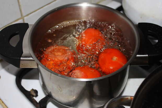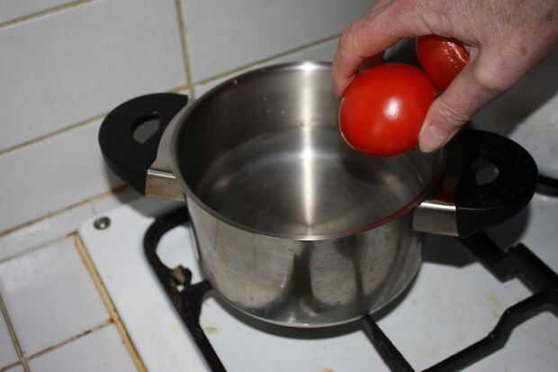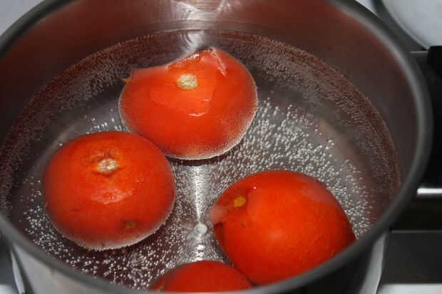 Llene la olla más pequeña con agua, hervir el agua y añadir los tomates. Después de minutos apagar la luz, retirar el agua y enfriar los tomates con agua fría. Esto es truco impresionante para cómodo pelar la capa de tomates. (creo que se va utilizar en la mayoría de recetas de cocina). Ahora retire la piel de los tomates.
