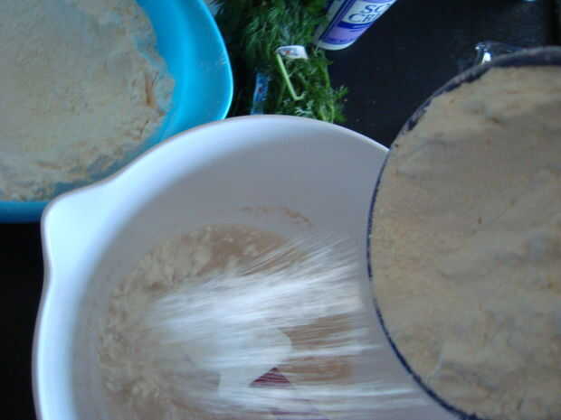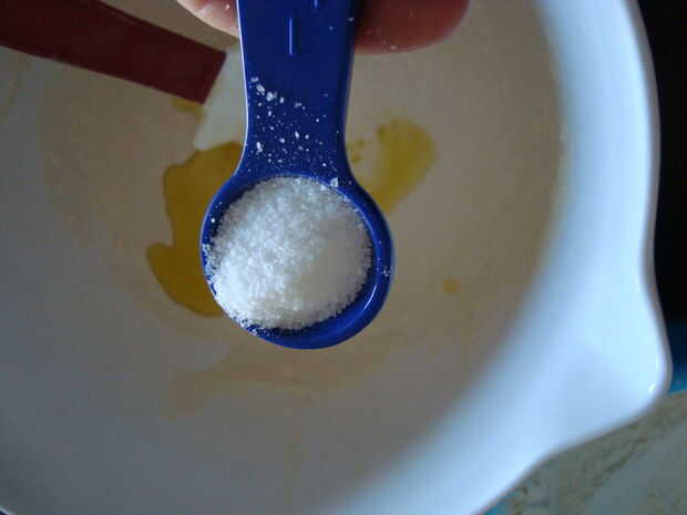 Poco a poco añada la harina de 2,5 c, revolver en la misma dirección. Agitar vigorosamente durante 1 minuto aproximadamente. Espolvorear sal, añadir el aceite y continuar licuando el resto de la harina hasta que la masa es menos pegajosa.