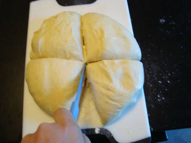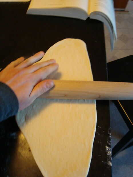 Suavemente empuje hacia abajo la masa y dividir la masa en 4 porciones iguales. Aplanar cada trozo con la mano que ha sido ligeramente enharinada.  Trabajando con una pieza de masa en un momento, tome un perno de balanceo, estirar y aplanar la masa en un óvalo de 8 a 10 pulgadas de largo y 5 a 6 pulgadas de ancho y no más de 1/4 pulgada de espesor.