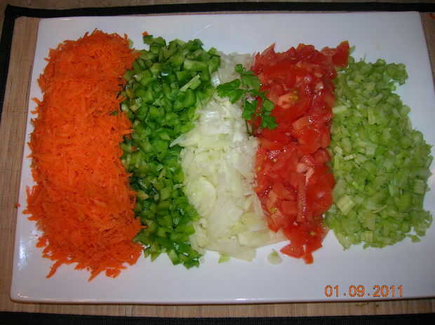 Mientras tanto, corte las verduras tan pequeño como sea posible. Para las zanahorias usé un rallador.