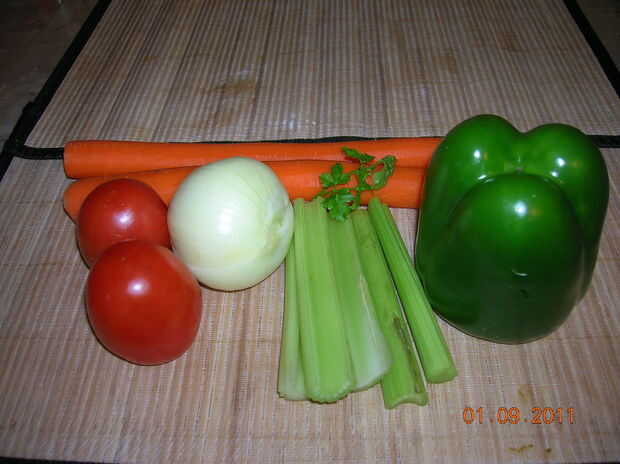 Para este paso se utiliza el apio, tomates, pimiento y 1 cebolla.