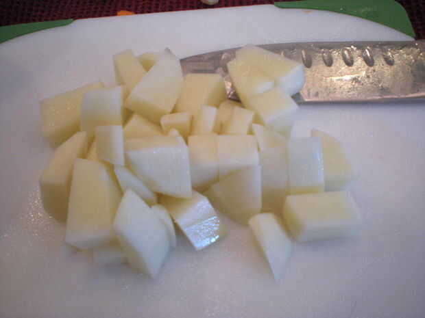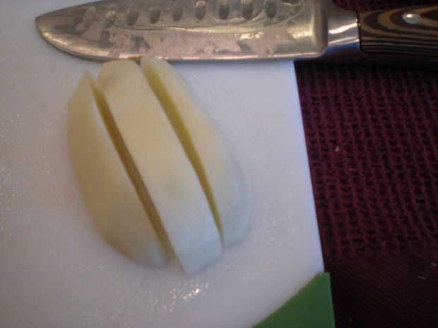 Rebanada el pelado patatas por la mitad , luego Coloque cada mitad sobre una tabla de cortar .