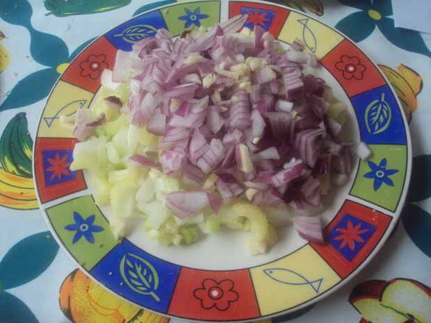 Primero picar el apio y las cebollas, quieres piezas de tamaño medio no para adelgazar.