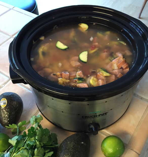 Añadir todo a la olla. Sostenga el cilantro, aguacate, queso de cojita y la cal. Es para la sopa acabada. Dar el bote un buen revuelo, situado en baja e ir a buscar algo que hacer durante las siguientes 6 horas. Tiempo de preparación total para mí fue unos 20 minutos.