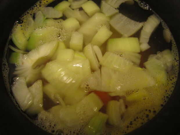 -Agregue la zanahoria picada y la cebolla al agua. Cocinar a fuego lento durante 10 a 15 minutos, hasta que el caldo adquiere un color naranja pálido y las cebollas estén transparentes.