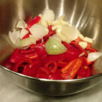 100 gr = 1 grande pimiento largo rojo limpiar, hoyos y pedacitos de blanco extrae, corte para arriba, ponderada cuando se corta para arriba