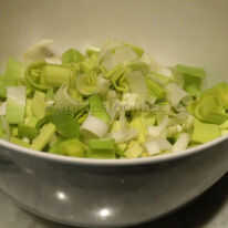 320 gr (5 tazas) limpiar, lavar, almohadilla piezas secos, puerros, blanco y verde de corte