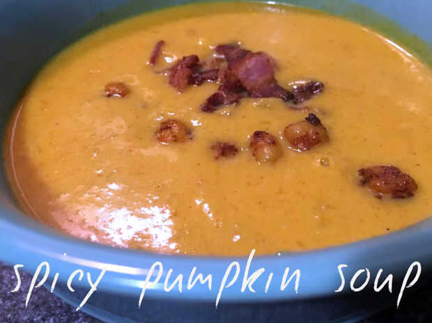 Mi novio nunca ha comido a cualquier tipo de calabaza (calabaza incluido) en un plato salado. Siempre prepara me comidas deliciosas, mucho de ellos no planificados y sin una receta, simplemente por mirar en la nevera y nuestra despensa y sólo tirar cosas juntos. Aunque estoy a mitad de camino decente en improvisar comidas, quería impresionarlo y lo cocinar una comida deliciosa que hizo calabaza la estrella en un plato salado. Con las temperaturas más frías acercándose rápidamente, pensé que haría uno de nuestros platos favoritos: sopa. Dicho esto, estamos ambos incapaces de comer cualquier cosa sin dumping en unas cucharadas de pimienta de Cayena o la salsa picante, así que sabía que tenía que hacer algo muy sabroso a lo wow. Después de mirar a través de nuestra despensa, nevera y algunas recetas en internet, he creado esta sopa picante de calabaza con panceta y garbanzos fritos especiados.