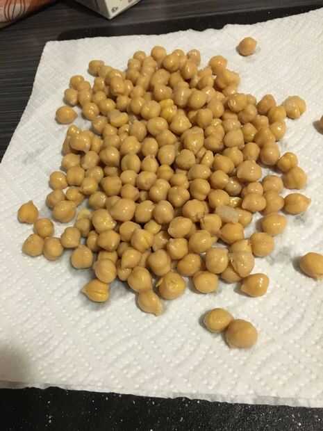 Escurra y enjuague la lata de garbanzos. Colocar sobre una capa de toallas de papel y luego pat les seca con otra capa de papel de cocina encima de ellos. Colocarlos en la sartén con la grasa de la panceta, a fuego medio, junto con el azúcar moreno, ajo en polvo, tumérico molido, pimentón, Chile en polvo y sal. Se fríen los garbanzos hasta que estén crujientes, unos 5-7 minutos.