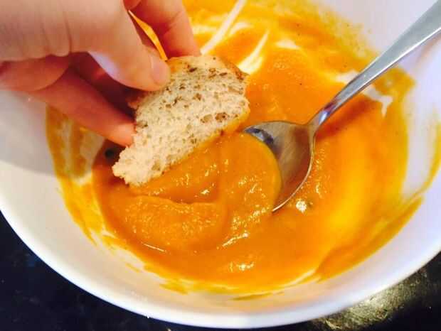 Ayer hice esta sopa muy sabrosa. Sirve esta deliciosa sopa con calabaza salado y pan de queso feta. Usted no puede ir mal con esta combinación. Es como una comida en sí mismo. Bonito para algunos buena mantequilla real sobre las rebanadas de calabaza