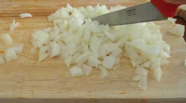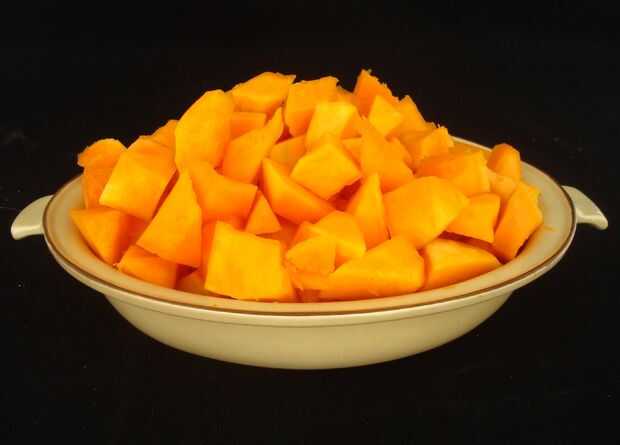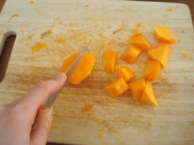 Pelar la calabaza y las patatas.  Picar en cubos (aproximadamente 1" de tamaño).