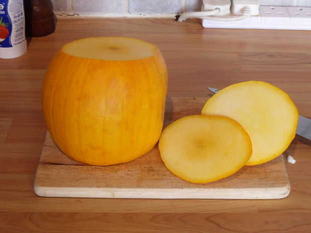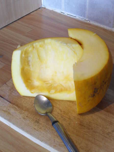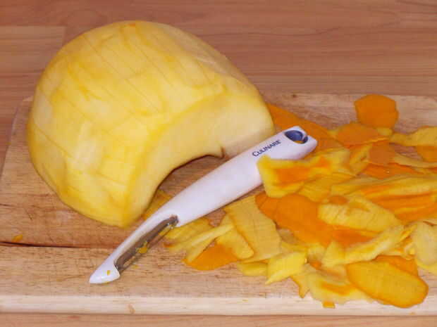 Mina era una bonita calabaza fresca y joven de mi jardín y así la piel seguía siendo muy delgada. Un policía hizo el trabajo en la eliminación de la piel. Si el tuyo es un poco mayor o más grande que necesita afeitar con un cuchillo afilado.