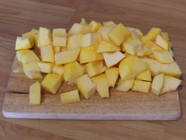 Cortar las dos mitades de la calabaza pelada en cubos de tamaños uniforme.