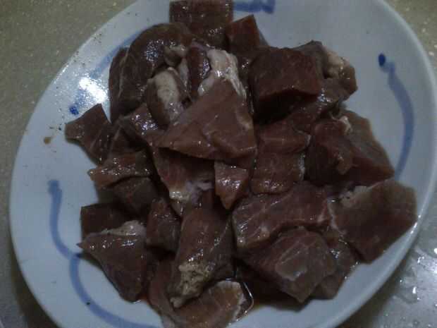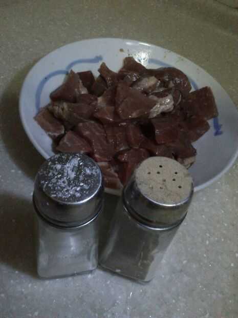 cortar ese trozo de carne en morder cubitos de tamaño. marinar la carne con sal y pimienta.