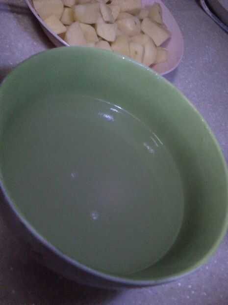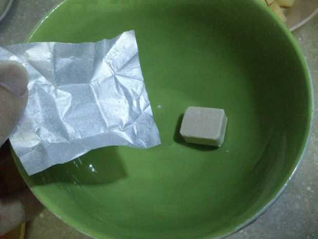 tira la envoltura de cubo de carne, echar en un bol (no el muy, muy agradable buscando plato todavía) y vierta en agua caliente. Revuelva hasta que el cubo se derrite en el agua