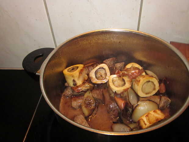 Poner carne, huesos y la cebolla en el bote. Cubra y reduzca el fuego a bajo.