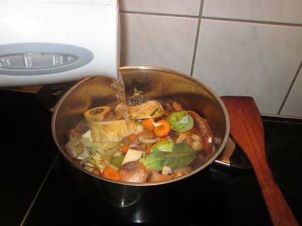 Una vez que tenga 1 / 2c más o menos de buen jugo marrón en la sartén, añadir 4c de agua, hojas de laurel y cualquier restos vegetales.  Cubierta. Llevar a ebullición y cocer a fuego lento por cerca de 1,5 horas. (Hasta que la carne tierna)