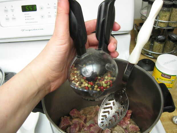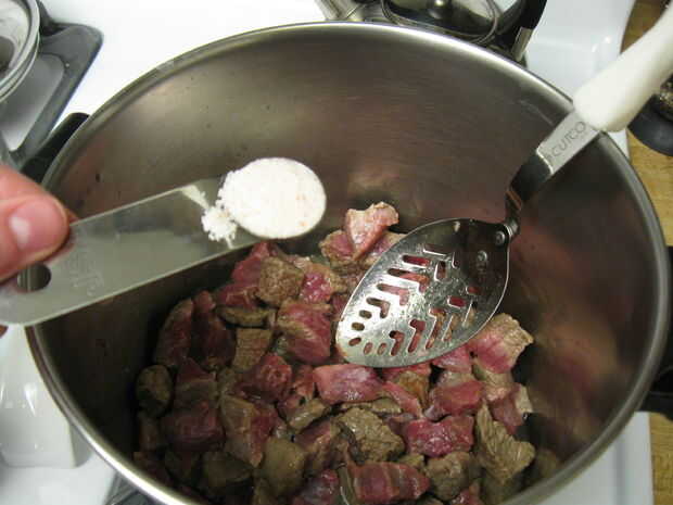 Mientras la carne se está dorando, añadir un poco de sal y pimienta. Si usted utiliza cualquier verdura enlatada, o usando tomates en todo, ir fácil en la sal. Usted siempre puede agregar más adelante! Usé 1 cucharadita de sal y 5 o 6 buenas rutinas de granos de pimienta.